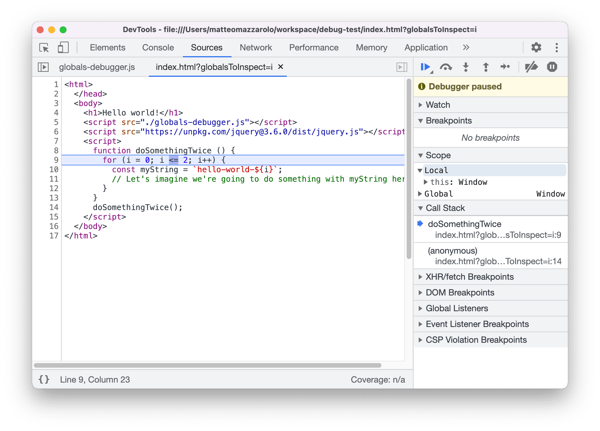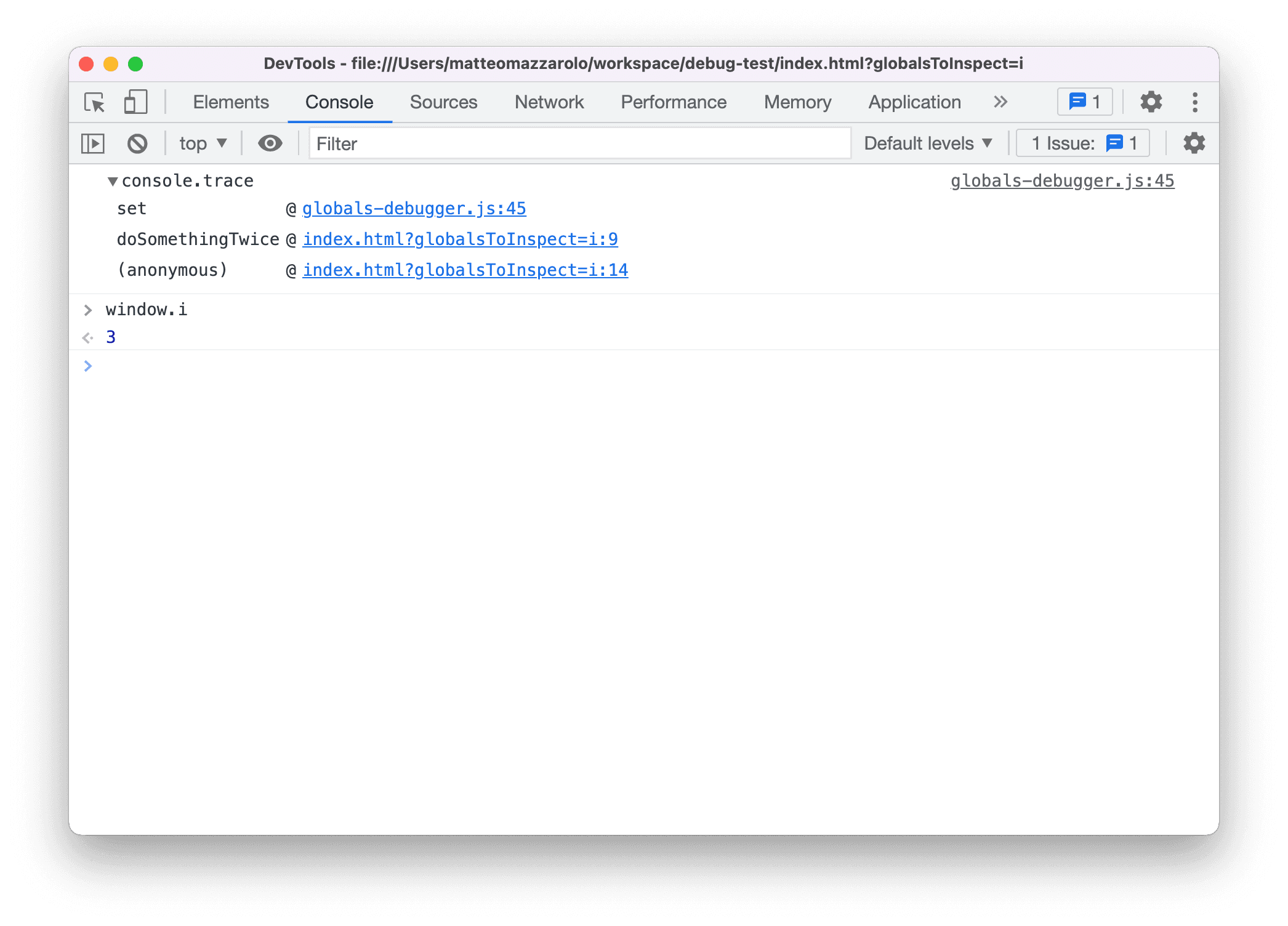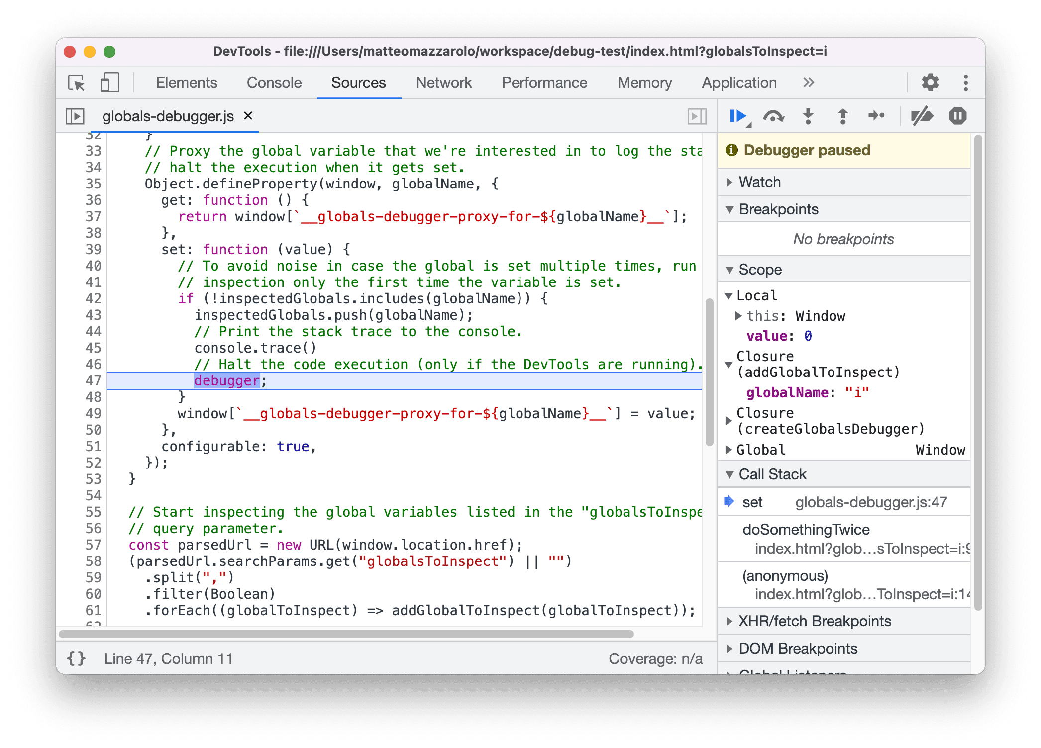 Opening the HTML page above with the ?globalsToInspect=i query parameter will immediately pause the code execution when the i variable is being set (notice that the globalName variable in the current closure is i in the right panel):